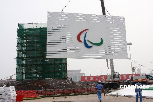 8月28日,北京殘奧會會徽開始在天安門廣場安裝。廣場東側,20個殘奧會運動標志取代了28個奧運會運動標志。輪椅橄欖球、輪椅籃球、硬地滾球、自行車、馬術等殘奧會運動造型初露。中新社發(fā) 追影 攝