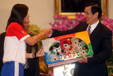 8月26日,中華臺(tái)北奧運(yùn)代表團(tuán)掌旗官(旗手)賴圣蓉(左)贈(zèng)送北京奧運(yùn)福娃給馬英九。(“中央社”圖)