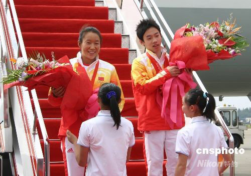 9月3日15時(shí)30分,北京奧運(yùn)會(huì)冠軍鄒凱、殷劍在家鄉(xiāng)人民的熱烈歡迎中回到了四川。在2008北京奧運(yùn)會(huì)上,來自四川瀘州的鄒凱勇奪自由體操、單杠、男子體操團(tuán)體三枚金牌,來自涼山的殷劍為中國代表團(tuán)拿下了第一枚奧運(yùn)會(huì)帆船金牌。中新社發(fā) 霍潺 攝
