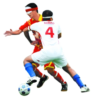 在昨天5人制(盲人)足球比賽的現(xiàn)場(chǎng),中國隊(duì)11號(hào)前鋒王亞鋒讓人眼前一亮,他不僅獨(dú)中兩元,而且全場(chǎng)射門高達(dá)15次,超過全隊(duì)總射門次數(shù)的一半。記者坐在看臺(tái)上不時(shí)聽到周圍的觀眾如此評(píng)價(jià)王亞鋒:“小伙子腳下技術(shù)活兒真好,估計(jì)一些健全人足球愛好者的功底都比不上他。”