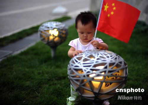 9月8日,北京正在舉辦殘奧會(huì)的國(guó)家體育場(chǎng)外,一位可愛(ài)的小朋友往“鳥(niǎo)巢路燈”上插國(guó)旗。中新社發(fā) 廖攀 攝