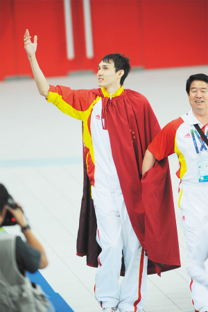 雖然最終收獲的還是“銀鑲玉”,但是楊博尊的心情已和8日晚有著天壤之別,臉上掛滿了笑容!斑@雖然不是我的主項(xiàng),但是我發(fā)揮得很好,超越了自己,F(xiàn)在我終于知道,‘水立方’不僅有‘金鑲玉’,還有更多的是超越。無論是我,還是我的隊(duì)友,我們都很努力,都在不斷地超越自己!迸d奮的楊博尊披上了早就準(zhǔn)備好的“戰(zhàn)袍”,這本是他為自己奪冠時(shí)準(zhǔn)備的。