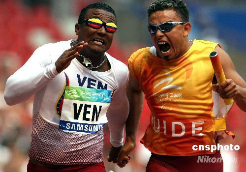 北京殘奧會(huì)田徑比賽9月16日繼續(xù)在國(guó)家體育場(chǎng)“鳥巢”進(jìn)行,委內(nèi)瑞拉隊(duì)在男子4x100米接力T11-T13級(jí)決賽中,以43秒55的成績(jī)獲得亞軍。圖為委內(nèi)瑞拉隊(duì)最后一棒選手菲爾南多·菲雷爾在助手的吶喊加油聲中奮力沖向終點(diǎn)。中新社發(fā) 任晨鳴 攝