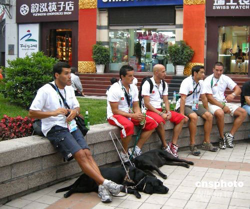 2008年9月16日下午,幾名參加北京殘奧會的外國運動員來到王府井游覽購物,忠實的導盲犬一直尾隨在其中的盲人運動員左右。中新社發(fā) 玉龍 攝