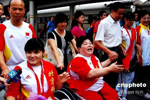 9月21日早上8點(diǎn)30分左右,從北京駛向南昌的Z67次列車?磕喜九_(tái),江西省參加北京殘奧會(huì)的3名運(yùn)動(dòng)員凱旋而歸。許多市民手捧鮮花、手舉紅旗來到現(xiàn)場夾道迎接運(yùn)動(dòng)員。中新社發(fā) 胡國林 攝