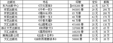 4、由于一些客觀原因,我們無法把作者作品所有版本的印數(shù)統(tǒng)計(jì)出來。上榜作家的版稅數(shù)字,如果將他們作品的各種版本加以統(tǒng)計(jì),數(shù)目可能還要更高。