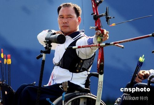 圖:中國(guó)選手郭偉鉛球賽場(chǎng)奪金牌破紀(jì)錄