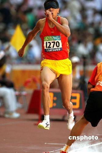 圖:中國盲人選手李端獲三級跳遠冠軍