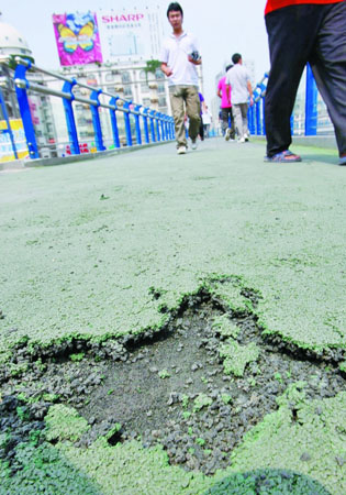記者問(wèn):天橋剛修成僅一個(gè)多月,為何會(huì)出現(xiàn)大面積破損現(xiàn)象。張成立說(shuō),該路段交通異常擁堵,天橋工期趕得非常緊!坝捎谛腥艘^(guò)橋,影響了施工,所以上面本來(lái)要噴的一層固化膠就缺少了,以致地墊黏合性差,F(xiàn)在,我們要在上面再噴固化膠!