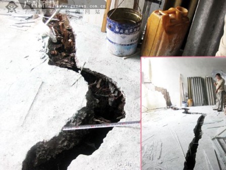 位于南寧市二塘大盤嶺的南寧新城福利五金總廠,因受這兩天大雨的肆虐,使得該廠建材車間地板突然開裂,出現了一條從車間的圍墻裂起一直延伸至地面80多米長、有些地方寬約60厘米的大裂縫,使人看得觸目驚心。