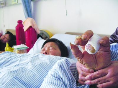 昨天中午,記者在高淳縣人民醫(yī)院見到了邢老太,她此時(shí)躺在病床上,正在掛水,面色異常蒼白,一旁的女兒雙眼通紅,不住地?fù)崦赣H的手臂。“真是太過分了,他們能這樣對(duì)待一名老人嗎?”女兒哭著告訴記者,那少了的一節(jié)手指就是被城管隊(duì)員硬生生扯斷的。
