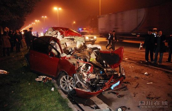 昨晚(25日)9時許,三環(huán)路南三段,一輛載了8個人的紅色世嘉與一輛大卡車發(fā)生嚴重追尾,車內(nèi)兩男一女當場死亡,另外5人,包括兩名小孩傷勢不重,被送往市一醫(yī)院。