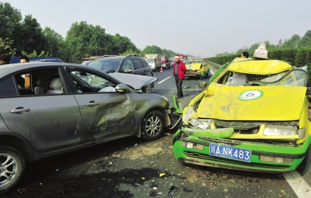 黃先生當(dāng)時(shí)駕車,正好撞上了陳先生的出租車。黃回憶當(dāng)時(shí)由于濃霧,他看到陳先生的出租車時(shí),已經(jīng)停不下來,徑直撞了上去。隨后另外一輛出租車則撞在了他的車后。