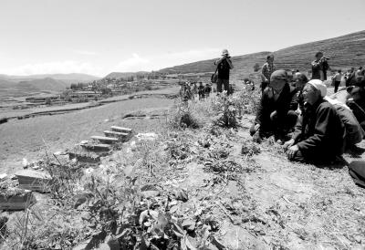昨天下午,在擺放遺體的黃坡地里,一隊消防官兵默默地用鐵鍬挖掘著。在一排新買的棺木旁,4口大坑很快挖成。悲傷的人們?nèi)砑堝X,燒給逝去的親人。