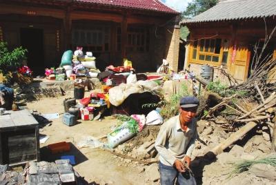 吃完飯后,董春暉扛著工具下地拔草,其他的一家老小4口人便開始清理倒塌的兩間房屋。董大娘告訴記者,這座房屋有四間是前年蓋的磚瓦房,有兩間是土坯房。7月22日,甘肅岷縣漳縣發(fā)生6.6級(jí)地震后,這兩間土坯房倒塌了,當(dāng)時(shí)幸虧家人都在磚瓦房里,否則真的不敢想象!斑^一會(huì)武警官兵過來幫忙把兩間土坯房拆除,如果不是地震,這兩間房子再住十年也沒問題!倍竽锿锵У卣f。
