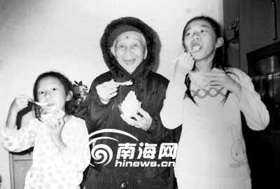 孫阿婆堅持運動自然體格強健。而兒孫們對她無微不至的關愛則讓她感到快樂。孫阿婆膝下有6個子女,也都已年過半百,如今一大家50多人五代同堂,其樂融融。平時,兒女們都很疼愛孫阿婆,幾個兒女輪流接她去家里住,她住在哪家,其他兒孫們也經常去看望她,給她買一些營養(yǎng)品,陪她聊聊天。孫阿婆百歲壽辰那天,兒孫們?yōu)樗≈貞c祝,看著兒孫滿堂,一家人和和睦睦,孫阿婆極為幸福。(宋亮亮)