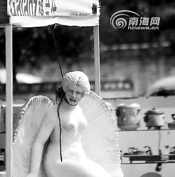 記者趕到現(xiàn)場看到,一個美女雕塑被商家用紅色繩子栓住脖子。少女雕塑臉上好象流露出難受的表情。經(jīng)過的行人都議論紛紛。城市雕塑是一個城市文明的象征之一,商家不文明的行為,與城市發(fā)展非常不和諧。(汪承賢)