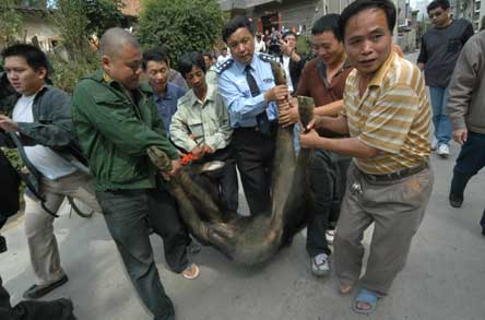 記者隨即向福州市森林公安局反映,該局局長親自帶人到場查看,確定了這是一只蘇門羚。由于該羚羊約重100公斤,森林公安請來了福州市動物園兩位專家支援。為避免其傷人,專家決定先對其麻醉。