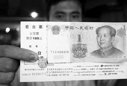 昨日,一讀者向本報(注:東南快報)曝料稱,“張學(xué)友廈門演唱會”的門票,用面值1元的人民幣做防偽標(biāo)簽,該讀者疑惑些舉是否對人民幣的不尊重。