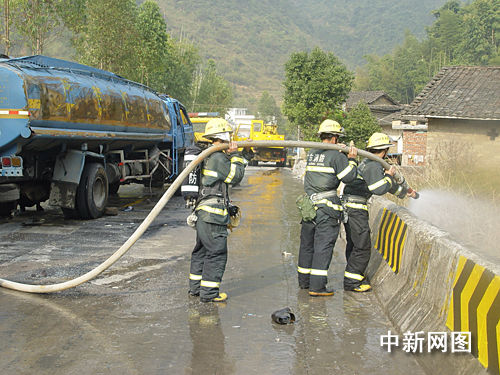 新豐縣公安局副局長陳如鋒組織交警很快封鎖了現(xiàn)場,實施交通管制。消防官兵穿上防化服,用兩臺消防車從河里抽水,用射水槍噴射側(cè)翻的槽罐車,迅速稀釋從車上流出的液體甲醛。吊車隨后趕到,工作人員帶上口照,冒著生命危險,靠近槽罐車,將側(cè)翻的槽罐車吊起,消防官兵繼續(xù)用射水槍向槽罐車猛烈射水。