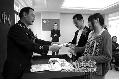 在得知女友懷上了孖仔后,為了給即將出生的兩個(gè)寶寶一個(gè)合法的身份,中山市看守所內(nèi)的服刑人員袁某提出要與女友結(jié)婚。看守所所長(zhǎng)證婚,婚禮現(xiàn)場(chǎng)的布置由看守所的民警一手張羅。11月21日,袁某與女友如愿在中山市婚姻登記中心登記成為合法夫妻,成為中山市首個(gè)登記結(jié)婚的服刑人員。