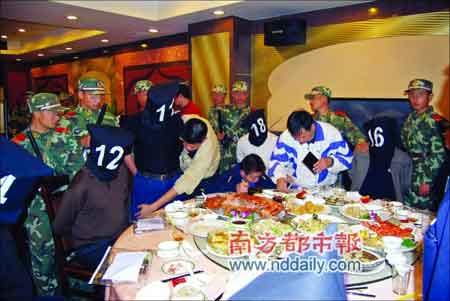 知情人說,抓捕行動(dòng)事先有周密的部署,臥底干探已提供詳細(xì)的線報(bào),顯示當(dāng)晚“錘頭笠”許建強(qiáng)的得力手下兼司機(jī)在4樓的30多個(gè)大型包房中舉辦的新居入伙酒席,出席者約200人。臥底提供的資料不僅包括宴會(huì)的時(shí)間、地點(diǎn),還包括具體出席的人員名單與樣貌特征。因此抓捕現(xiàn)場雖然有近1000人,但無關(guān)人員在現(xiàn)場就被疏散。一些為該團(tuán)伙成員脅迫的送錢者即使與犯罪嫌疑人同桌也被迅速辨認(rèn)出來,疏散出酒店。
