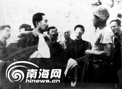 上午,身穿深灰色中山裝的周總理來(lái)到農(nóng)場(chǎng)橡膠園——這是儋縣愛(ài)國(guó)華僑1919年從南洋經(jīng)過(guò)千辛萬(wàn)苦引種成功的,叫“天任”、“蔡惠”膠園,它是新中國(guó)發(fā)展橡膠主要的采種基地。