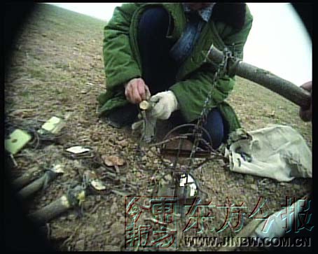 記者和知情人小強(qiáng)躲在草叢里,小強(qiáng)說(shuō):“他們就是捉雁人,撒下的只是少量的毒餌,最頂用的是他們正在設(shè)置的那一串串鐵夾,那是連環(huán)套,大雁被夾上就完了!
