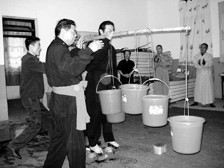 陳師傅說,除了踏刀提水外,他還有金剛腿、金槍刺喉等絕活!斑@些功夫源自少林。運(yùn)功后,身體的肌肉會(huì)變硬,可抵擋銳器!彼f,最先練踏刀提水時(shí),是嘗試性地站在刀刃上,當(dāng)時(shí)腳也會(huì)被割傷。隨著時(shí)間推移,腳皮越練越厚,在刀刃上堅(jiān)持的時(shí)間也越來越長。
