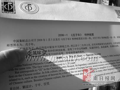 記者隨后來到楚雄集郵經(jīng)營部,花了2.2元也購買了一枚《戊子年》特種郵票首日封。該套首日封編號為2008-1,印量30萬枚,封上還加貼了中國集郵總公司的防偽標(biāo)簽。當(dāng)記者向工作人員詢問首日封文字中出現(xiàn)的錯誤時,這位工作人員顯然完全不知情,經(jīng)提醒看到后,她連連表示,這樣的情況以前從未發(fā)生過,這還是頭一次碰到。她隨即拿出和首日封一起配套發(fā)行的一套鼠年郵票仔細(xì)查看,記者注意到,上面有首日封設(shè)計(jì)者于平和任憑的介紹,并且在多處出現(xiàn)了“老鼠嫁女”的字樣,但并無任何差錯。據(jù)工作人員介紹,首日封在楚雄的發(fā)行量僅70枚,目前已銷售了近40枚。(王維娜 攝影報(bào)道)