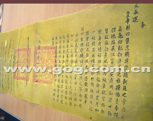 隨后,丁老伯小心翼翼地打開用黃布裹得嚴嚴實實的兩件祖?zhèn)鞑仄贰F渲幸患怯旋堷P等花紋的絹布,左邊是滿文,右邊是繁體漢字,開頭兩行寫的是“奉天承運,皇帝制曰……”,中間有兩個大的紅印,最后的落款是咸豐八年十一月十七日。丁老伯說,他也曾經(jīng)咨詢過,這種絹是古代專門用于皇帝發(fā)布圣旨的圣旨絹。
