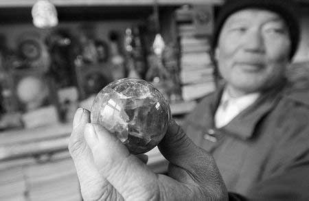 在郭國(guó)謙收藏室中任意掂出一件東西,都有一段故事。在收藏室一角的架子上,一枚直徑約有25厘米的綠色圓球引人關(guān)注,郭國(guó)謙將其拿至暗處,只見圓球發(fā)出熒熒微光!斑@就是人們常說的夜明珠。”郭國(guó)謙說。