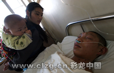 在燒傷科,尹家敏和他另外兩名受傷工友躺在同一間病房,焦急的家屬守候在床邊。其中一名工人茍子明今年才22歲,他的兒子剛滿9個(gè)月。