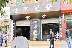 白云區(qū)景泰街隆康社區(qū)居委會(huì)的劉主任說(shuō),該店面此前也是做餐飲的,后來(lái)由于樓上住戶的投訴,被有關(guān)部門聯(lián)合取締了,F(xiàn)在的餐館雖取得了營(yíng)業(yè)執(zhí)照,也是因?yàn)樽魮?dān)心消防問(wèn)題去投訴而做不下去。居委會(huì)接到住戶的投訴后,就去做工作!拔覀兘(jīng)過(guò)努力,說(shuō)服了店主,今天下午那兩個(gè)工人就把靈堂撤掉了,事情也就解決了!