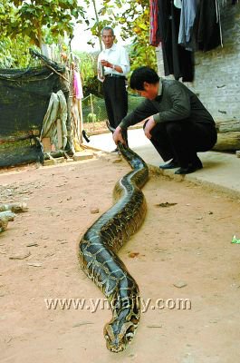 可最終,鄰居要走的7條小蟒蛇都先后死了,只有自己留下的兩條一直養(yǎng)到了兩公斤重。楊建松回憶說,當時他在生產(chǎn)隊當聯(lián)防隊員,每天除了下班后飼養(yǎng)兩條小蟒蛇外,上班時他也一直帶在身上,有空就拿出來玩耍。在1995年的一天,他帶著兩條已經(jīng)有50多厘米長的小蟒蛇出去玩時,一個親戚看見他衣服口袋里裝著什么東西撐得鼓鼓的,就將手伸進他的口袋想掏出來看個究竟。誰知伸進口袋一抓,就抓住了口袋中的小蟒蛇,拿出來一看,嚇得驚慌失措的這位親戚慌忙一下子就將手中的小蟒蛇摔在地上,結果這條小蟒蛇當場被摔死了。