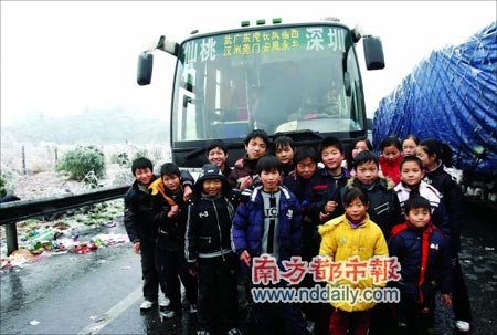 “記者同志,救救我們吧,我車上有20多個小孩!”昨日上午10時30分左右,南方都市報記者姜鏘和徐文閣正在京珠高速公路受災最為嚴重的廣東省韶關市坪石入口附近采訪,一位穿著綠色軍大衣面容憔悴的司機,攔下了記者的采訪車。