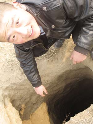 “不知誰在村西山頭上挖了兩個深洞,很奇怪!弊蛱焐衔,記者接到村民提供的報料后立即趕到現(xiàn)場采訪。在村民的指引下,記者看到在兩座長滿雜草的古墓土堆上被人挖出兩個深約5米、直徑在1米左右的洞。村民告訴記者,前幾天,有人發(fā)現(xiàn)一到深夜,就有幾個人影在這里挖什么東西,村民們也沒有在意,可是昨天早上,有村民上山時突然發(fā)現(xiàn)了這兩個很奇怪的洞,一名膽大的村民還系著繩子下去看,洞口雖然剛好容一個人下去,但洞里面卻有很大空間。