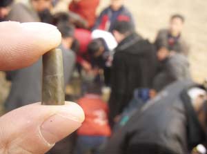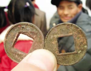 昨天上午,許多住在西石橋村周圍的村民聽說此事后,紛紛趕來尋寶。記者在現(xiàn)場看到,幾十名當(dāng)?shù)卮迕衲弥ぞ咴谕炼牙飦y挖,還有的村民將剛剛挖出來的古錢幣拿給記者看。一名姓王的大爺拿著幾枚挖出來的錢幣告訴記者,過去在這座古墓周圍,曾出現(xiàn)過許多這樣的古錢幣,聽老一輩講,很久以前這里就是一片墳地,盡管也有村民種地時經(jīng)常發(fā)現(xiàn)古錢幣,但從來沒有人敢到這里亂挖的。記者現(xiàn)場看到,聞訊趕來挖寶的村民越來越多,一上午先后有上百人光顧。村民挖出的這些古錢幣上有不規(guī)則的花紋。