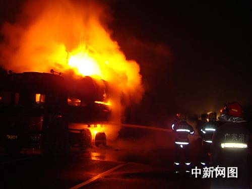 當(dāng)晚10點(diǎn)35分許,乳源消防中隊(duì)接到報(bào)警后,立即兩臺(tái)水罐消防車(chē)和13名消防官兵,與交警、路政等部門(mén)先后火速趕到現(xiàn)場(chǎng)進(jìn)行滅火。