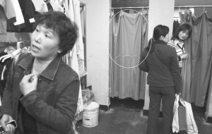 記者趕到現(xiàn)場(chǎng)時(shí),只見酷特服裝店的2間試衣間都是一張門簾遮擋,現(xiàn)場(chǎng)還不斷有人進(jìn)去試衣服。