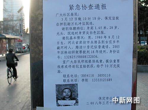 據(jù)悉,事件發(fā)生后,保定監(jiān)獄及當(dāng)?shù)毓、武警等部門(mén)出動(dòng)大批警力在周邊各個(gè)主要路口設(shè)卡布控,同時(shí)在市區(qū)街道、小區(qū)醒目位置張貼通告,全力通緝追捕越獄逃犯。(完)