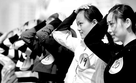 此次全國空姐招募大賽的負責人彭先生說,因為空姐是個服務型職業(yè),需要她們具有親和力,說“茄子”主要是看她們的笑容是否自然,牙齒是否潔白,是否招人喜愛。但在說“茄子”環(huán)節(jié),不少美女聽完考官的口令,都像沒有聽到,表情非常僵硬,有的高昂著頭,一副盛氣凌人的架勢!袄浔,長得再漂亮給你服務也讓你感到不舒服!币晃辉u委說,“冰美人”他一個都沒讓過關。