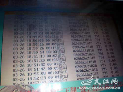 昨日下午,龔先生通過移動(dòng)公司的自動(dòng)查詢系統(tǒng)查詢,發(fā)現(xiàn)自3月19日至本月1日,“0206262”給他打來的電話有上千個(gè)之多,其中3月26日最為瘋狂,一天有100余個(gè)電話打入,僅當(dāng)天18時(shí)45分至18時(shí)52分這一時(shí)段,就有17個(gè)騷擾電話輪番“轟炸”,來電號(hào)碼以“02062621818”居多。龔先生無奈地說,他的日常生活已受到嚴(yán)重影響。