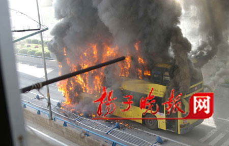 昨天上午,本報(bào)網(wǎng)站()和手機(jī)報(bào),第一時(shí)間發(fā)布了該事件的新聞和圖片。車窗、車門及車內(nèi)物品均已變形,火焰沖天直躥到高架橋上,現(xiàn)場(chǎng)觸目驚心的場(chǎng)面,是揚(yáng)子晚報(bào)熱心讀者朱飛龍送來的。