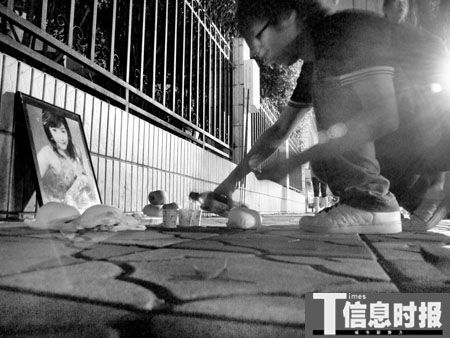 4月20日中午,譚靜死后15天,其追悼會在廣州殯儀館低調(diào)舉行。默哀的時候,代替哀樂的是一首她生前愛唱的歌,歌中唱道:“每個故事都有屬于她的結(jié)尾”。整個靈堂,哀聲一片。 (□本版撰文 時報記者 段一鳴 )