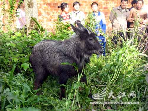 無獨(dú)有偶,昨日下午3時(shí),距都昌縣中館鎮(zhèn)幾公里的鄱陽(yáng)縣銀寶湖鄉(xiāng)銀寶村農(nóng)民馮奇,在自家門前的菜園內(nèi)發(fā)現(xiàn)一只“野山羊”在偷吃菜葉。只見這家伙身高1.2米左右,體重約100公斤?吹接腥藝^,“野山羊”飛快逃竄,村民們四處堵截,3個(gè)小時(shí)后才將它在一條胡同內(nèi)制服。鄱陽(yáng)縣林業(yè)局的野保專家趕到現(xiàn)場(chǎng)告訴村民,這只“四不像”學(xué)名叫蘇門羚。