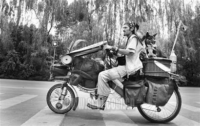 頭上戴著酷酷的骷髏頭巾,蓄著暗紅色的三角尖小胡子,脖子和手腕上掛著古怪的項(xiàng)鏈和手環(huán)……昨日中午,一個(gè)騎著“哈雷式”自行車,長(zhǎng)相酷似海盜的老外在東城拐下街引起了不少好奇者的圍觀。這個(gè)名叫Alexandro(如右下圖)的巴西人從2003年就開始騎著自己改裝的自行車出發(fā),橫跨了歐亞大陸的多個(gè)國(guó)家,接下來的時(shí)間里他還將騎著車和他唯一的伙伴——小黑狗“杰”完成環(huán)游世界的夢(mèng)想。