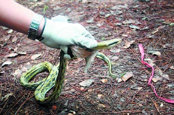 袋口剛一打開(kāi),一群蛇便爭(zhēng)先恐后爬出來(lái),呼吸著山間清新的空氣,有的爬到了樹(shù)上,有的則迅速消失在草叢中……昨日,湖南省森林公安局及省林業(yè)廳森林保護(hù)站工作人員在黃花機(jī)場(chǎng)查獲非法運(yùn)輸?shù)?163.4公斤野生蛇類(lèi)后,將其中的部分野生蛇在湖南森林植物園內(nèi)現(xiàn)場(chǎng)放生。
