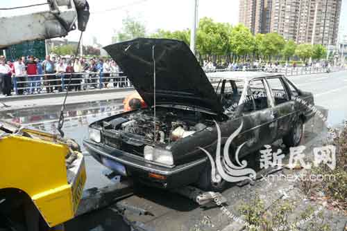 新民網(wǎng)記者看到,這輛車牌號為滬BT91**的桑塔納轎車已被燒得面目全非,駕駛室和發(fā)動機(jī)也全部被燒毀,汽車前后引擎蓋被燒得翹起,整個車被大火燒得僅剩下一個鐵殼。