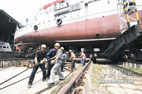 上午9時,位于白沙洲的武漢南華高速船舶工程股份有限公司內(nèi),21臺移船小車在絞索的牽引下,沿鋼軌緩緩將中山艦送到移船大車上。約10:10,移船大車在四臺牽引機(jī)車牽引下,載著中山艦沿著南華公司的滑道,向江邊駛?cè)ァ?/p>